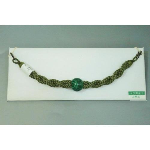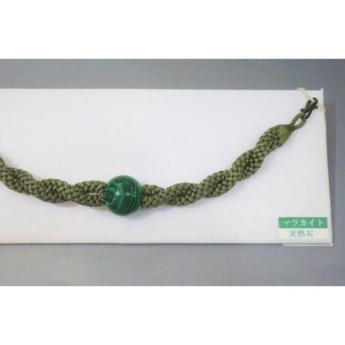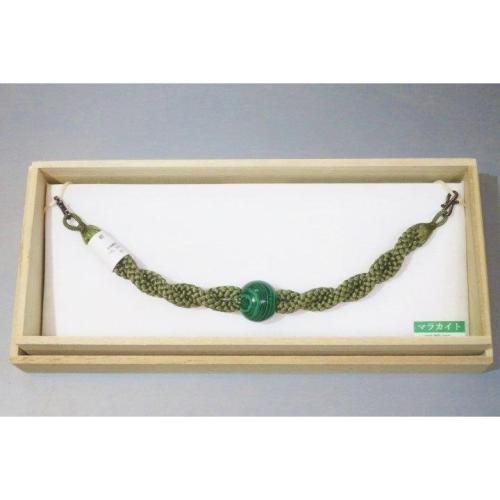 こちらのお品は、天然石を使用した羽織紐です。中央の天然石は孔雀石・マラカイトで、左右は灰緑のねじり紐を使いました。色味が難しいため現物優先でお願いします。