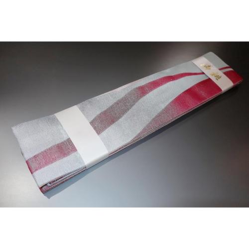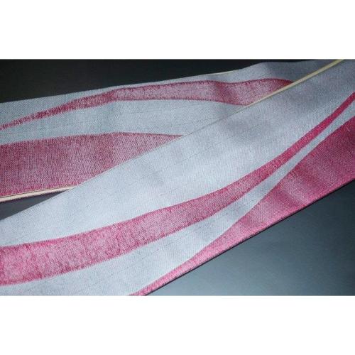 弐11229RM 男角帯 絹交ぜ織り西陣織К繻子織 緋桜流線形と灰銀 芭蕉色の金筋縞 上仕立て全通