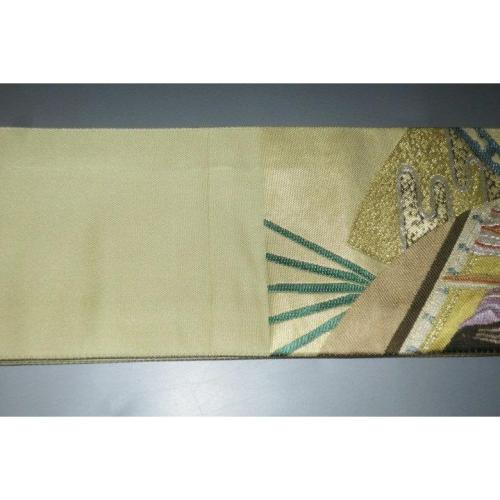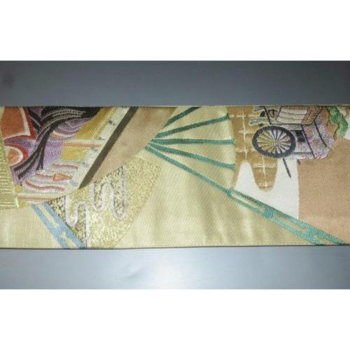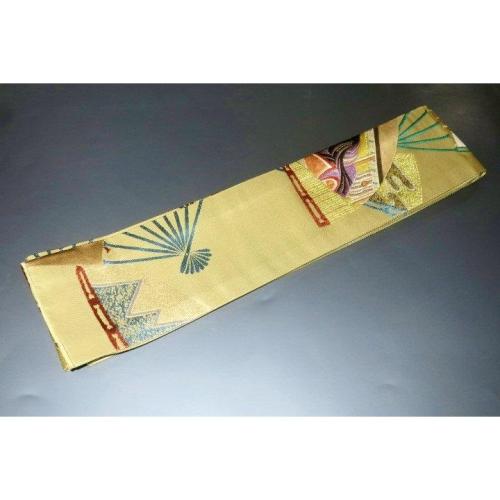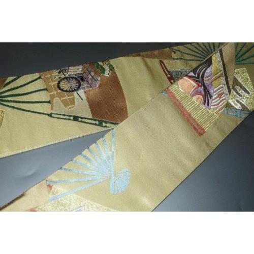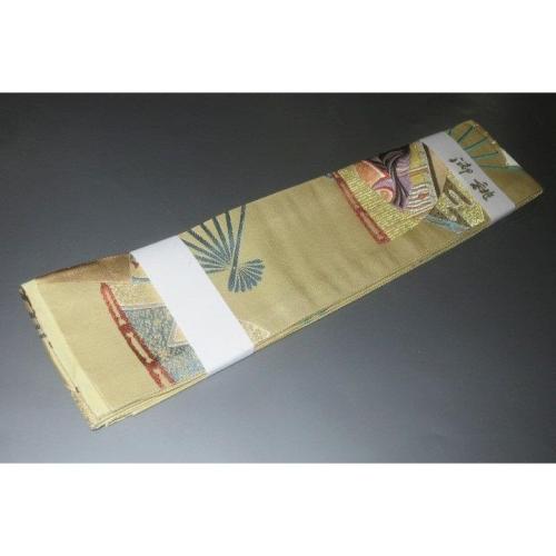 弐11391RM 男角帯 本絹西陣錦織 К沈金色地金襴・御所解き扇面平安絵巻文様 新品 金属糸使用
