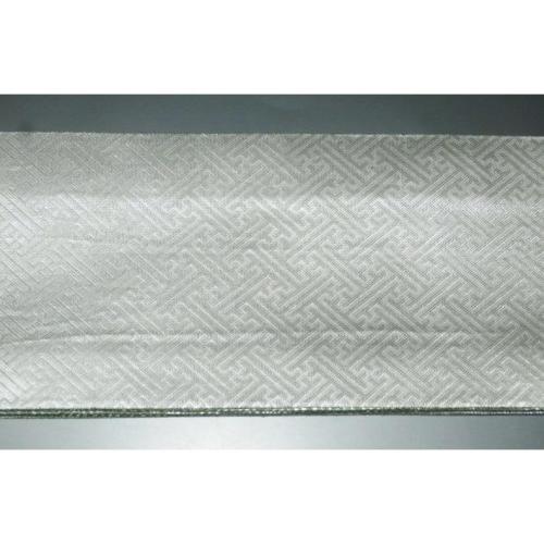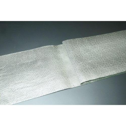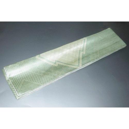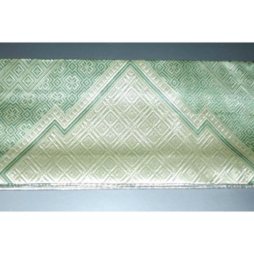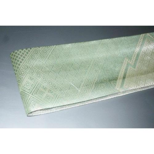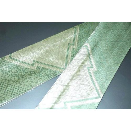 弐11420RM 男角帯 本絹銀糸西陣織角帯К銀地銀欄銀緑 古典裂取り稲妻菱と沙綾形の両面全通 別誂
