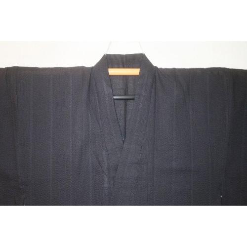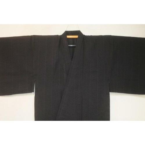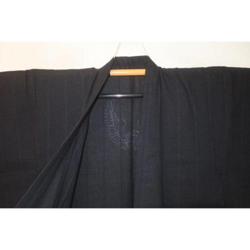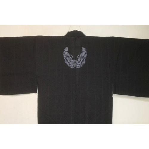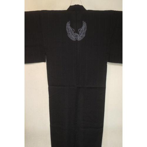 こちらのお品は、遠州織の綿麻を反物から仕立てた物です。状態は、生地から仕立てた新品のサンプルです。真っ黒の無地に背にイーグルのバックエンブレム、イーグルのタトゥーのようです。仕立てはミシンだけで仕立ててありますので襟つけが少し粗い感じですが、稽古や浴衣程度であれば、如何でしょうか。阿波しじら織に近く、ところどころ透いた織で涼しげで通気性のいいしじら織地です。縫いの手法が気になる方は避けてください。