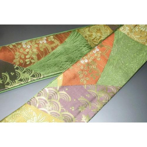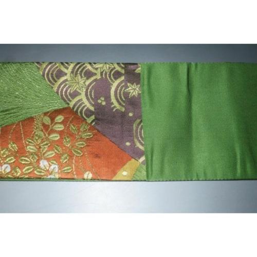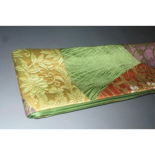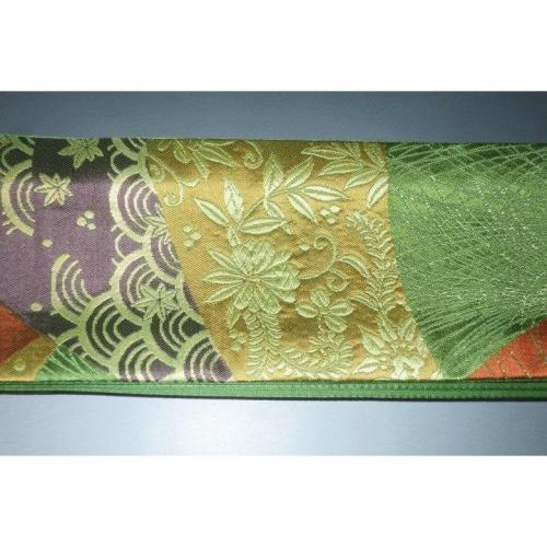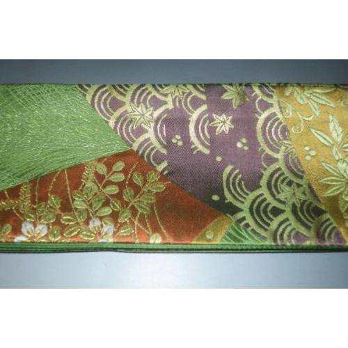 こちらのお品は、本絹西陣織練貫の角帯です。片側六通仕立てで、裏は抹茶色の無地です。表の色柄は抹茶色地、裂取り古典文様です。色味が難しいため現物優先でお願いします。