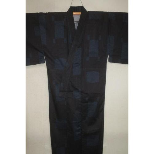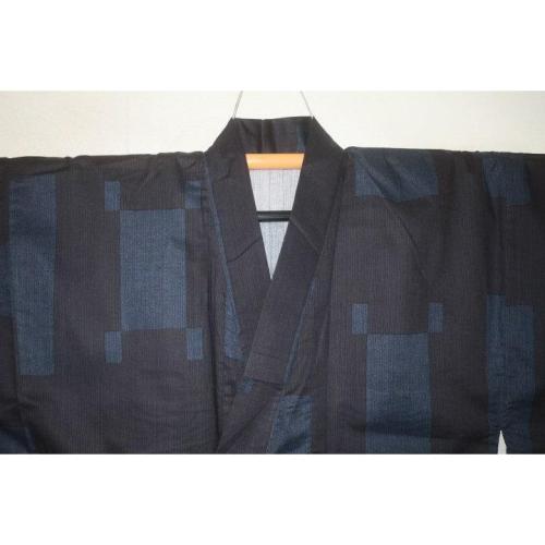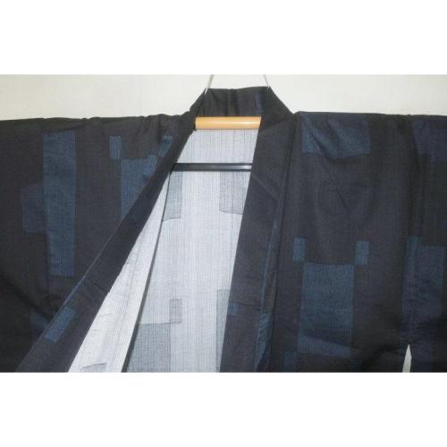 弐11556RM 遠州綿紬 男の染絣の着物浴衣単衣 裄71丈153К黒瑠璃濃淡地に平角と揺り角・造形