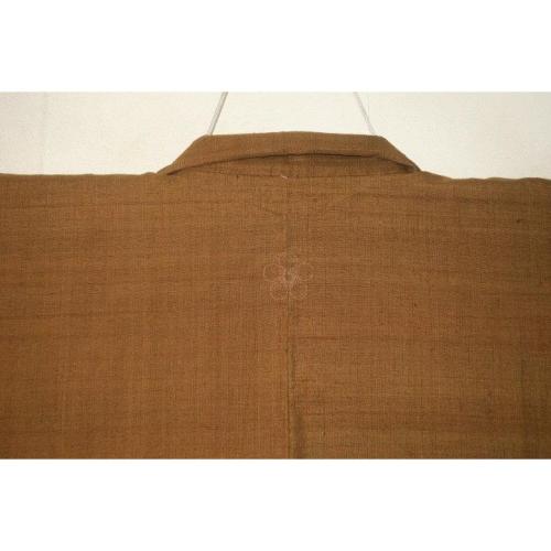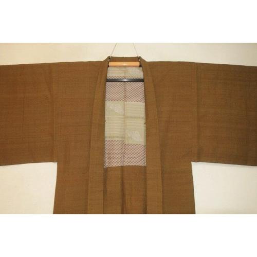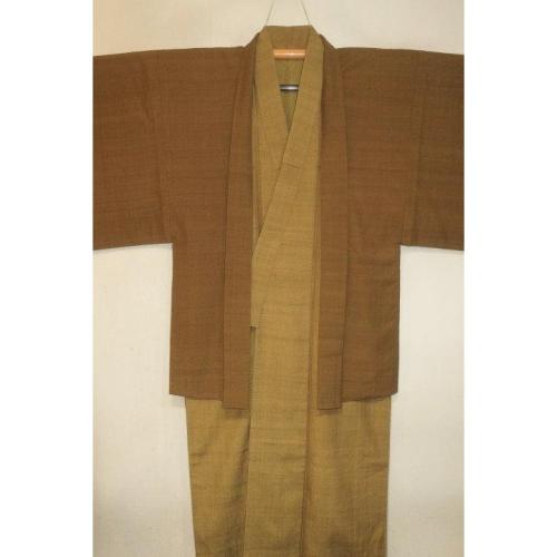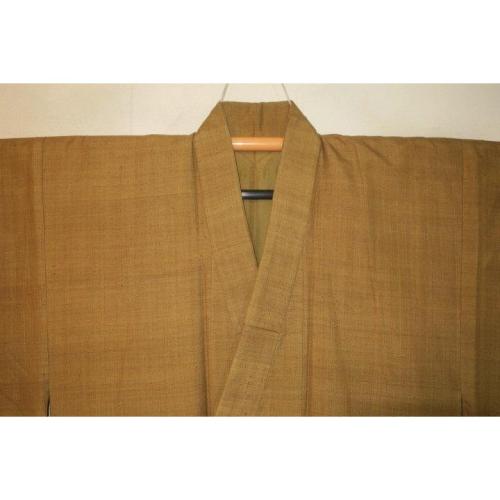 弐11028 本絹京紬粗細 男着物羽織 裄67丈137К苅安染め真鍮色と黄土色の濃淡 超大物絶品