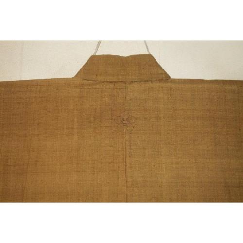 こちらのお品は、本絹京紬の染物の最高クラスの品です。この品は超高級呉服の部類に入り、紋を入れれば紋付になる品とよくご説明している、ひとつふたつ上のランクの品です。柔らか物の位置づけでもあるわけです。状態は中古ですがかなり綺麗です。色は苅安染め、真鍮色と黄土色です。着物は袷。素晴らしい上下です。二度と出ないでしょう。色味が難しいため現物優先でお願いします。背に縫い紋、梅鉢、着物も羽織も一つ紋です。この織の品は10年ほど前に当社の落札品で170000円で取引されています。お見逃しなく。元は茶人の袴用と思われます。