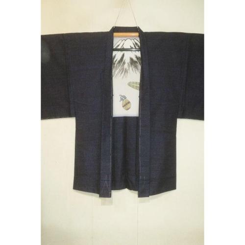 弐11060RM 本絹本真綿結城紬 男着物羽織 裄71丈146К黒瑠璃色の虎斑「結」印 極上品 証紙