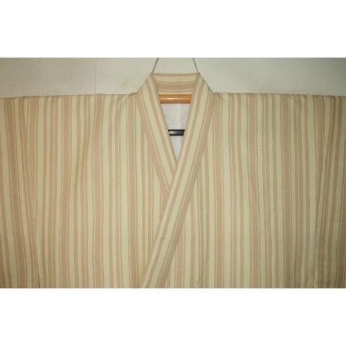こちらのお品は、シルク化繊丹後縮緬調の江戸小紋の袷の着物です。ミシン手縫い併用の呉服仕立ての新品です。着物のみです。化繊の染物調ですが、本絹並みです。むしろ本絹より扱いやすいかもしれません。芭蕉色濃淡の粋縞の江戸小紋です。裏は平絹に化繊のサテン地です。色味が難しいため現物優先でお願いします。状態は当社で仕立てた新品のサービス出品です。お洒落男子の洗えるいい着物如何でしょうか。一点物。