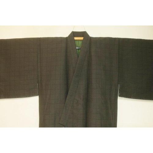 拾11090RM シルク化繊丹後縮緬調 男着物袷 裄70丈147К茶色濃淡・角通し千鳥格子文様 洗え