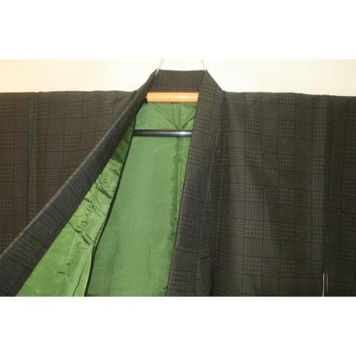 こちらのお品は、シルク化繊丹後縮緬調の江戸小紋の袷の着物です。ミシン手縫い併用の呉服仕立ての新品です。着物のみです。化繊の染物調ですが、本絹並みです。むしろ本絹より扱いやすいかもしれません。茶色濃淡の角通し千鳥格子の江戸小紋です。裏は平絹に化繊のサテン地です。色味が難しいため現物優先でお願いします。状態は当社で仕立てた新品のサービス出品です。お洒落男子の洗えるいい着物如何でしょうか。一点物。深緑にも茶系にも見えます。