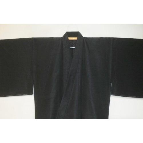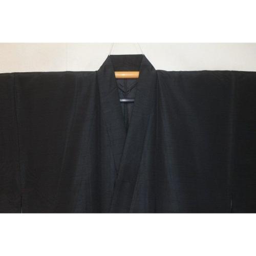 こちらのお品は、シルク化繊丹後縮緬調のお召の袷の着物です。ミシン手縫い併用の呉服仕立ての新品です。着物のみです。化繊の染物調ですが、本絹並みです。むしろ本絹より扱いやすいかもしれません。黒の無地感です。裏は平絹に化繊のサテン地で八掛のような胴裏の仕上げです。色味が難しいため現物優先でお願いします。状態は当社で仕立てた新品のサービス出品です。お洒落男子の洗えるいい着物如何でしょうか。一点物。