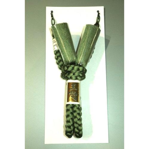 弊社で京都の組紐屋さんに特注したオリジナル製品です。素材は本絹で、色は銀色がちの抹茶色で、限定色です。