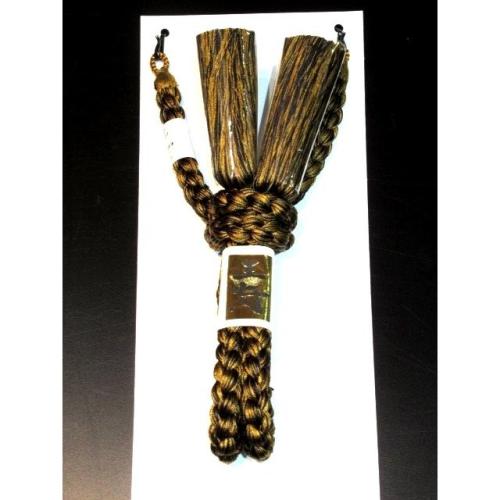弊社で京都の組紐屋さんに特注したオリジナル製品です。素材は本絹で、色は二色絞「虎斑・金に黒」で、限定色です。