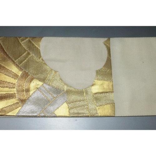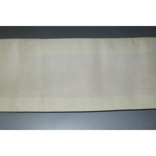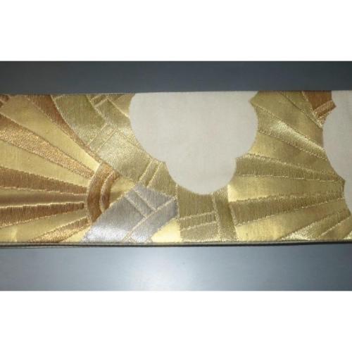 こちらのお品は、本絹西陣織の角帯です。片側六通の仕立てです。織は白地金襴に雲居に源氏車の図です。色味が難しいため現物優先でお願いします。