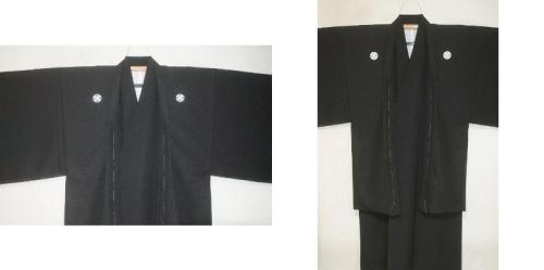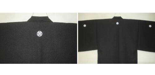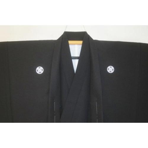 こちらはシルク化繊の丹後縮緬調の黒紋付の羽織と着物です。感染症流行で納品先が不要になったため、織元に仕立て上がりのままになっていた品の放出品で新品です。化繊ですが10万クラスの品。最高級ランクの縮緬生地で紋は丸に違い鷹の羽の五つ。家庭で洗濯可能です。着物の袖丈51cm、袖付け41cm。弓道にも使えますが弓道の方は袖付けをもう少し出しますので、落札時にお申し付けください。(袖丈は有料ですが、袖付けの直しは無料で対応します)。画像の家紋は丸に違い鷹の羽ですが、数組の在庫を持っていますので、注文時に紋の指定も承れます。この商品は紋入れ代金込みの価格です。弓道・茶道・能楽などの稽古に如何ですか。