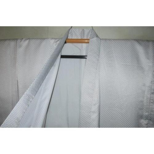 こちらのお品は、シルク化繊丹後縮緬綸子調の江戸小紋の袷の着物です。ミシン手縫い併用の呉服仕立ての新品です。着物のみです。化繊の染物調で白地の四ツ目絞り織文様です。むしろ本絹より扱いやすいかもしれません。裏は平絹に化繊のサテン地です。色味が難しいため現物優先でお願いします。状態は当社で仕立てた新品のサービス出品です。お洒落男子の洗えるいい着物如何でしょうか。一点物。