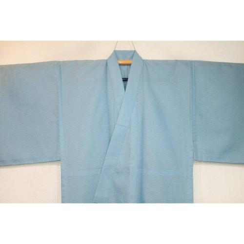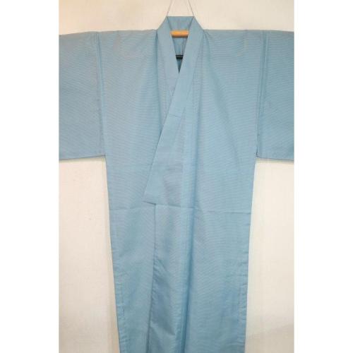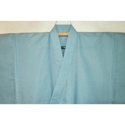 こちらのお品は、弊社で仕立てました化繊平絽の着物単衣です。色柄は水浅葱色の無地です。水色にも浅葱色にも見える色味が難しいので現物優先でお願いします。織は化繊平絽で、ポリエステル100%のため家庭でも洗えます。