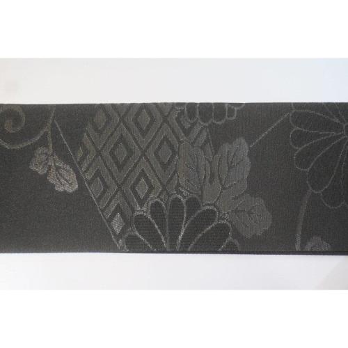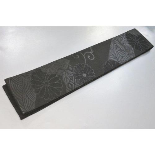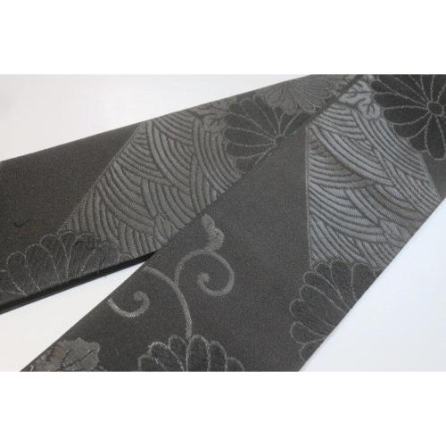 こちらのお品は、本絹西陣織黒繻子の角帯です。表裏同テーマの六通の仕立て。折柄は葉付き蔓菊と青海波文様です。