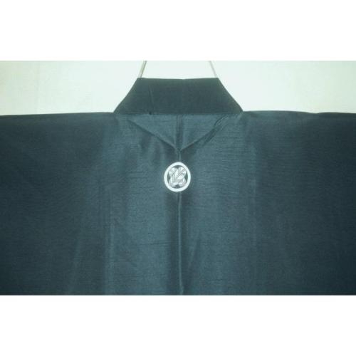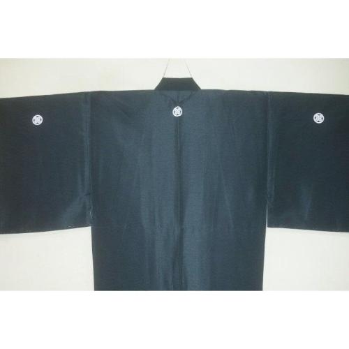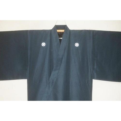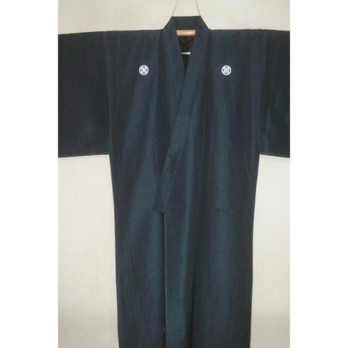こちらのお品は、シルク化繊丹後縮緬調のお召の袷の着物に紋を入れたものです。元の着物はミシン手縫い併用の呉服仕立ての新品です。紋付の着物のみです。化繊の染物調ですが、本絹並みです。むしろ本絹より扱いやすいかもしれません。青緑・お納戸色の無地感です。裏は平絹に化繊のサテン地で八掛のような胴裏の仕上げです。色味が難しいため現物優先でお願いします。状態は当社で仕立てた新品のサービス出品です。お洒落男子の洗えるいい着物如何でしょうか。紋は選べますので注文時に家紋の指定をお願いします。このサイズ限定になります。